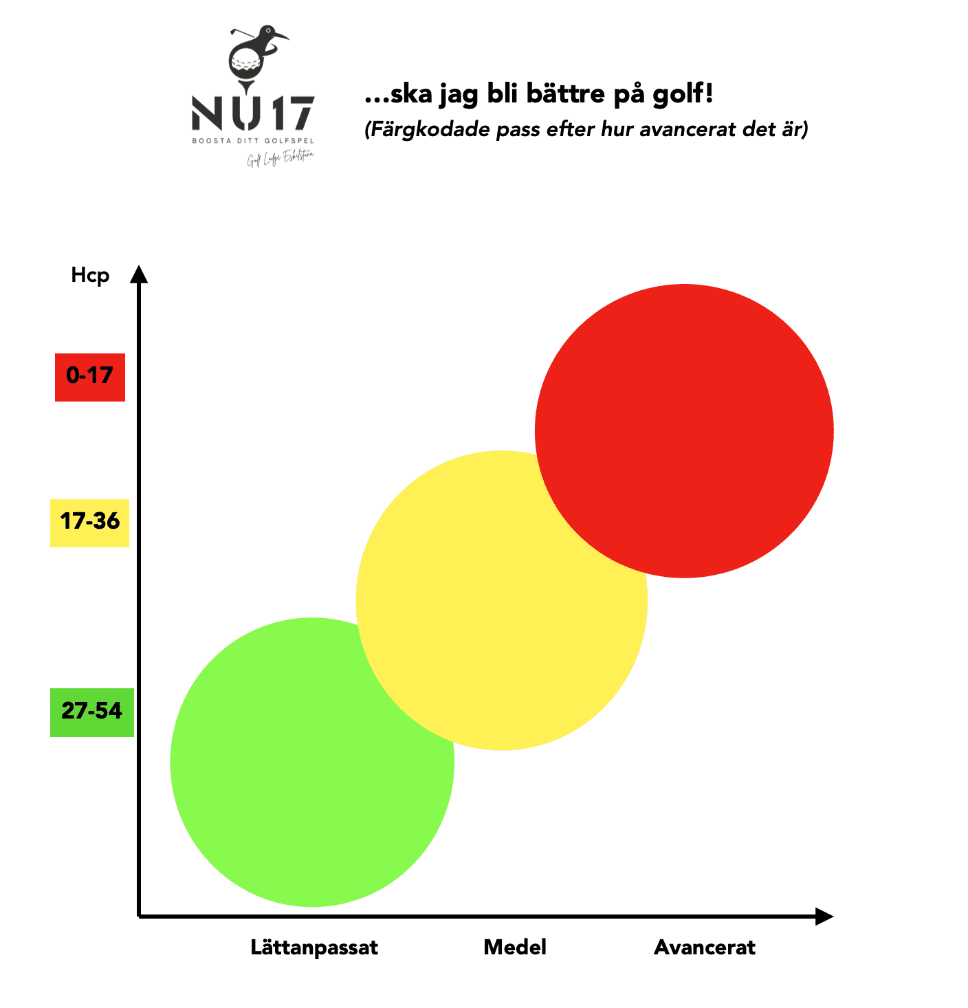Passen är färgkodade efter svårighetsgrad som går att se på bilden och sen även på schemat och det finns även en inriktning i hcp men du kan självklart utmana dig att vara med på röda pass även om du har ett högre hcp om du vill det.